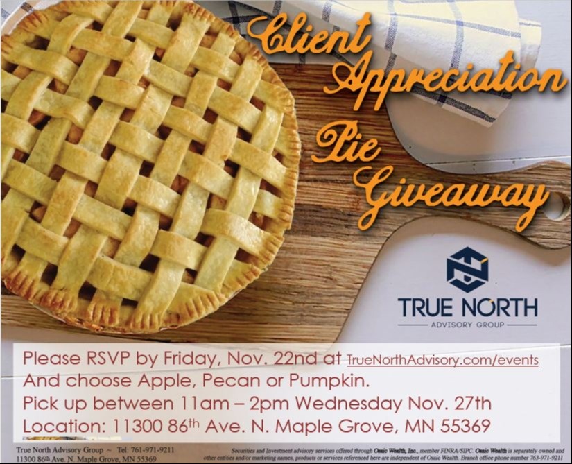 As a way of showing our thanks to our clients for the trust they have placed in us over the past year, we want to honor them with a Pie Giveaway for Thanksgiving.  Please RSVP on our event page or call our event line at 763-971-9211 or let your advisor know if you would like Apple, Pumpkin, or Pecan Pie.  Please RSVP by Friday November 22nd.  Please pick up the pie between 11:00 am and 2:00 pm on Wednesday November 27th at our Maple Grove location -11300 86th Ave. N. Maple Grove, MN 55369.